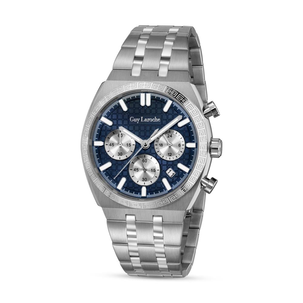 ساعات رجالية ماركة جي لاروش ذو تصميم فاخر، تتميز ساعة جي لاروش الرجالية بسوار مصنوع من الستانلس ستيل بالإضافة إلى الميناء الدائري ذو الإطار الفضي والوجه المميز باللون الازرق الذي يضفي الجمال ويجعلك مميزًا