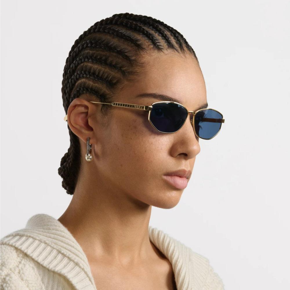 نظارة شمسية ديور, عبارة من الفخامة والرقي . تتميز بشكل جمالي آخاذ , والاطار المصنوع باللون الذهبي المزين بنقش مع توقيع CD باللون الذهبي , تكتمل اناقة العدسات باللون الازرق مما يضيف لمسة راقية الى أي اطلالة .