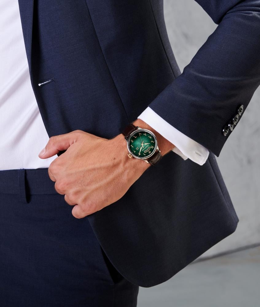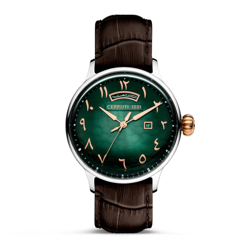 ساعات رجالية ماركة شيروتي ذو تصميم فاخر، تتميز ساعة شيروتي 1881 رجالي بسوار مصنوع من الجلد البني بالإضافة إلى الميناء الدائري ذو الإطار الذهبي والوجه المميز باللون الاخضر الذي يضفي الجمال ويجعلك مميزًا