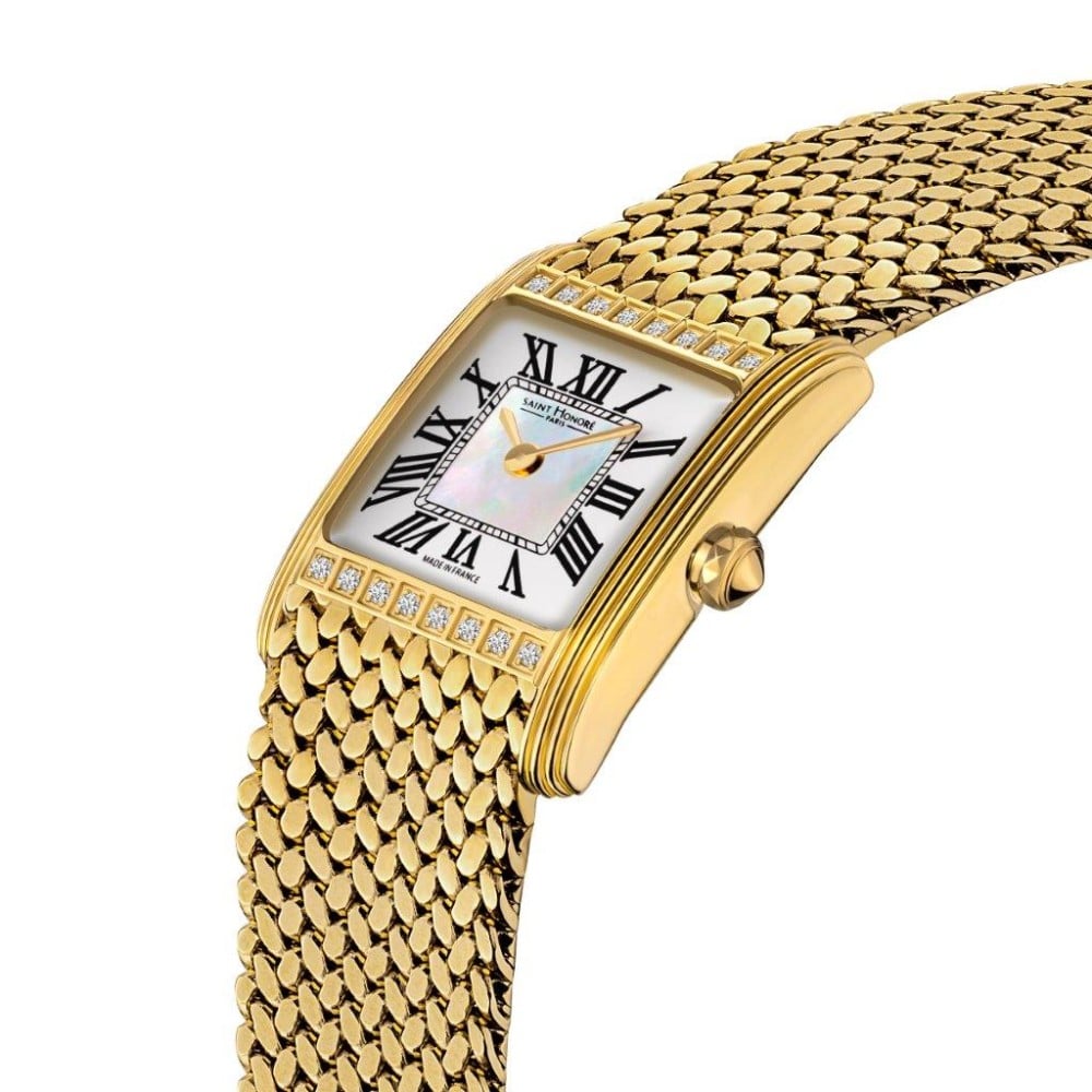 ساعة باليه رويال من سانت نوريه النسائية .تتميّز هذه الساعة الفرنسية بمينا مربع الشكل مصنوع من عرق اللؤلؤ باللون الأبيض ويزدانه مؤشرات بأرقام رومانية كلاسيكية ، ما يجعلها إضافة مثالية لمجموعتك . تقدّم الماركة ساعة باليه رويال بسوار ستانلس ستيل بتصميم شبكي وعلبة مرصّعة بالألماس يكملان بعضهما البعض بكل تناغم.
