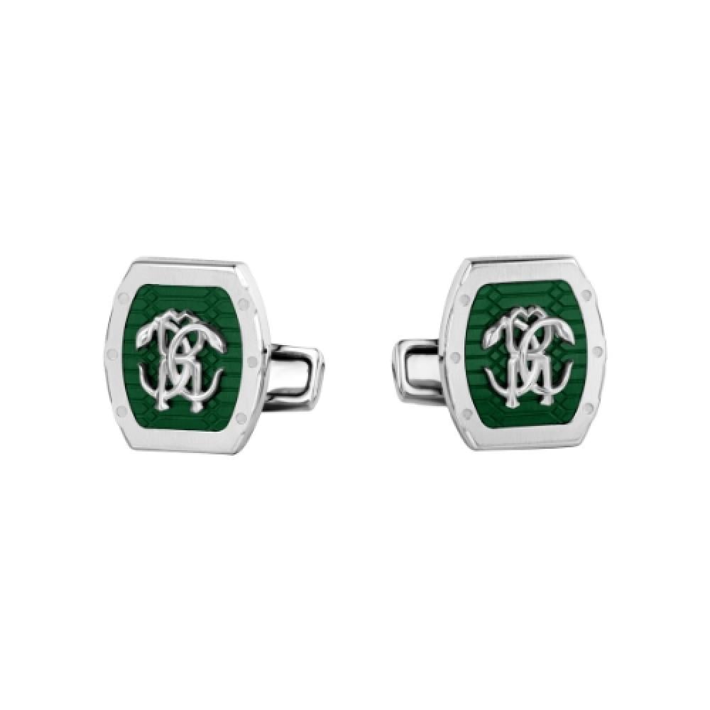 كبك روبيرتو كافالي الرجالي مصنوع من ستانلس ستيل باللون الاخضر , إضافة عليه العلامة التجارية روبيرتو كافالي رمز الجمال و الفخامة .