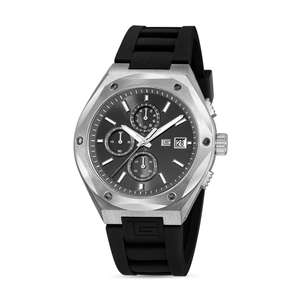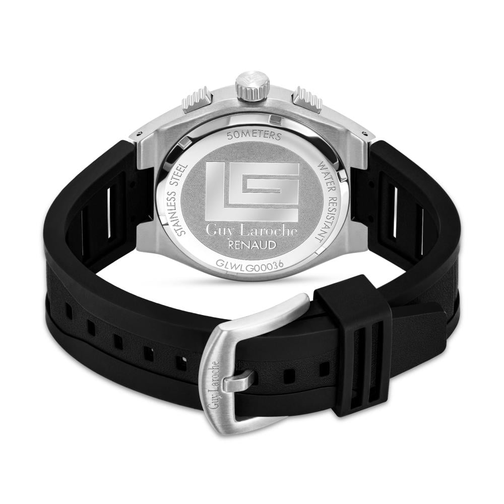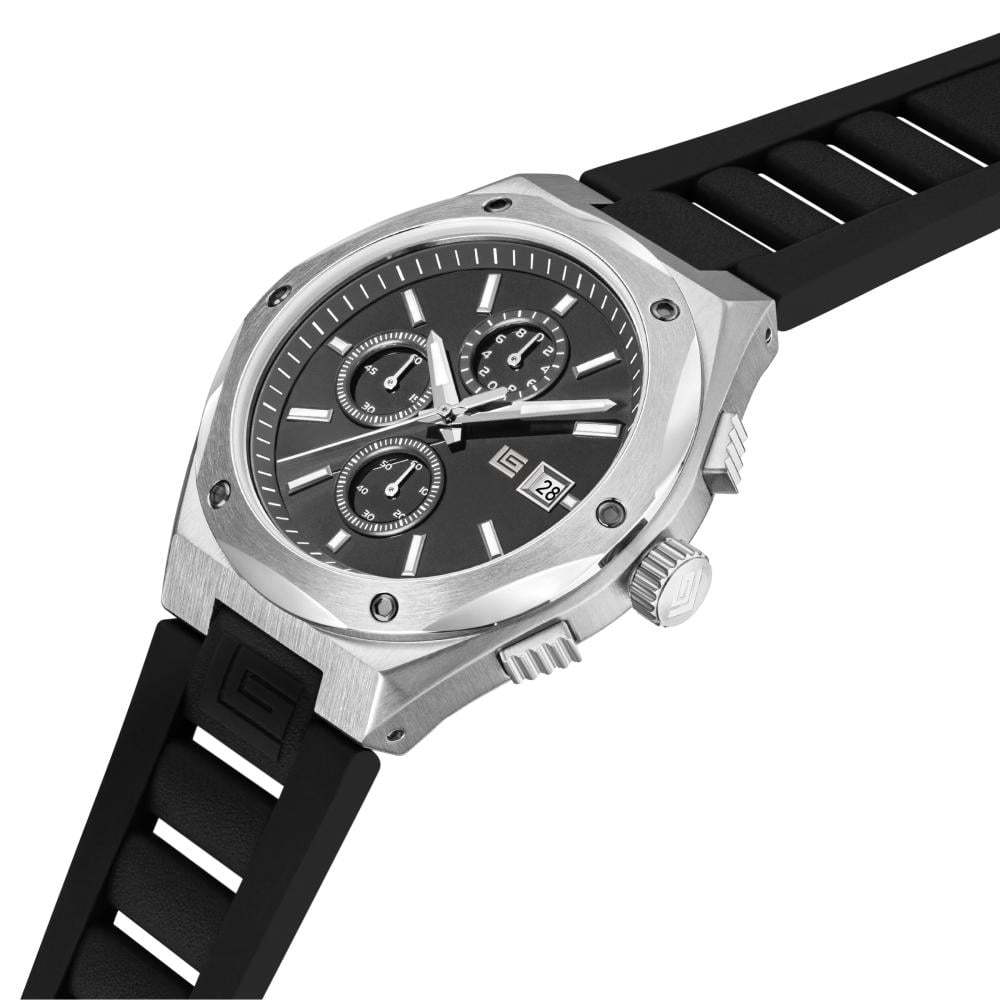 طقم رجالي ماركة جي لاروش ساعة مع اسوارة ذو تصميم فاخر، تتميز ساعة جي لاروش الرجالية بسوار مصنوع من السلكون بالإضافة إلى الميناء الدائري ذو الإطار الفضي والوجه المميز باللون الاسود الذي يضفي الجمال ويجعلك مميزًا
