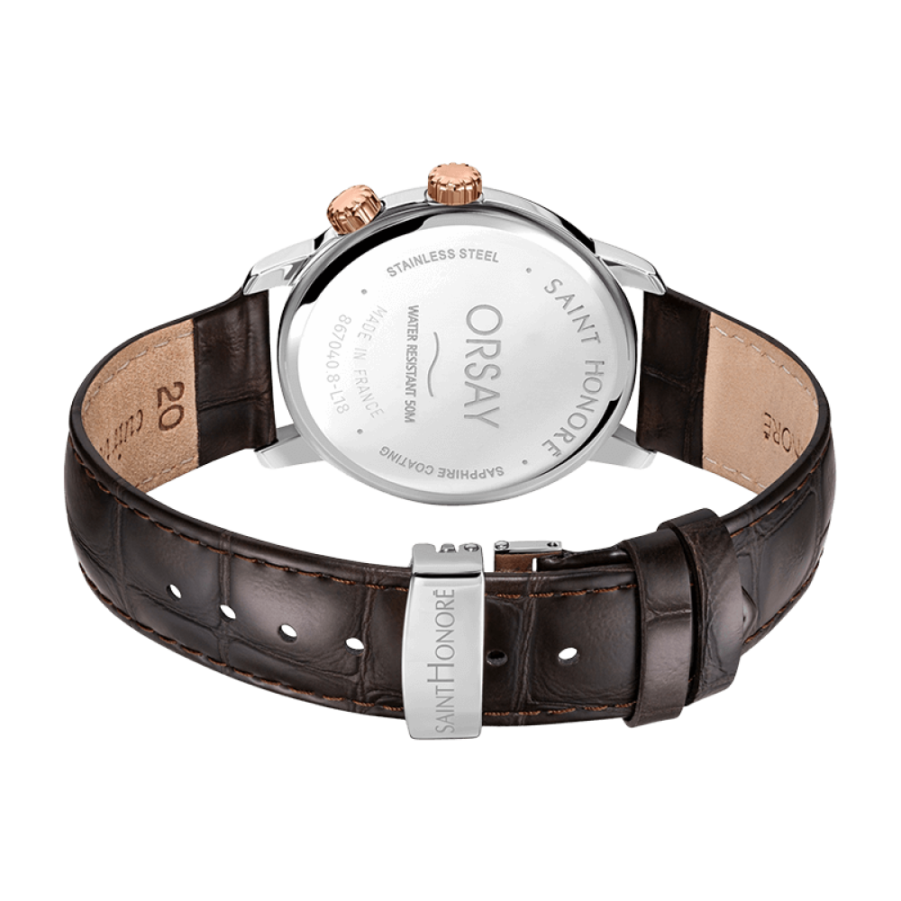 ساعة أورساي من سانت نوريه للرجال ذات الاصدار المحدود تتميز بقرص أزرق محكم الإغلاق بزجاج معدني، وتعمل بحركة كوارتز , يأتي الحزام الجلدي باللون البني الذي يزيد من جمال مظهر الساعة , علاوة على ذلك، فهي مزودة بمشبك قابل للطي يضمن ملاءمة آمنة على المعصم .