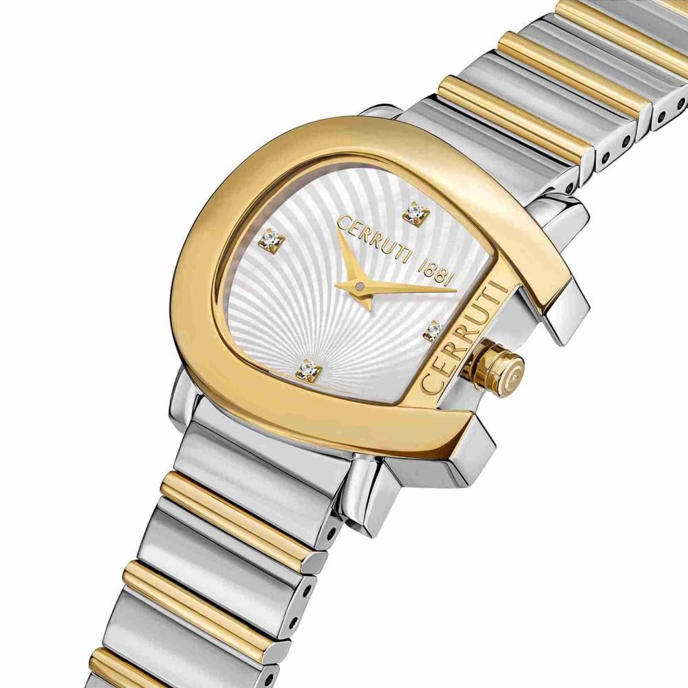 ساعة نسائية ماركة شيروتي 1881 ذو تصميم جذاب ومميز، تتميز الساعة بسوار ذهبي وفضي وميناء ذهبي ذو شكل غير تقليدي يحمل وجه أبيض وعقارب ذهبية تضفي الرقي. ساعات نسائية ماركة شيروتي 1881 ذو تصميم مميز مثيرًا لمن يبحث عن ساعة جذابة