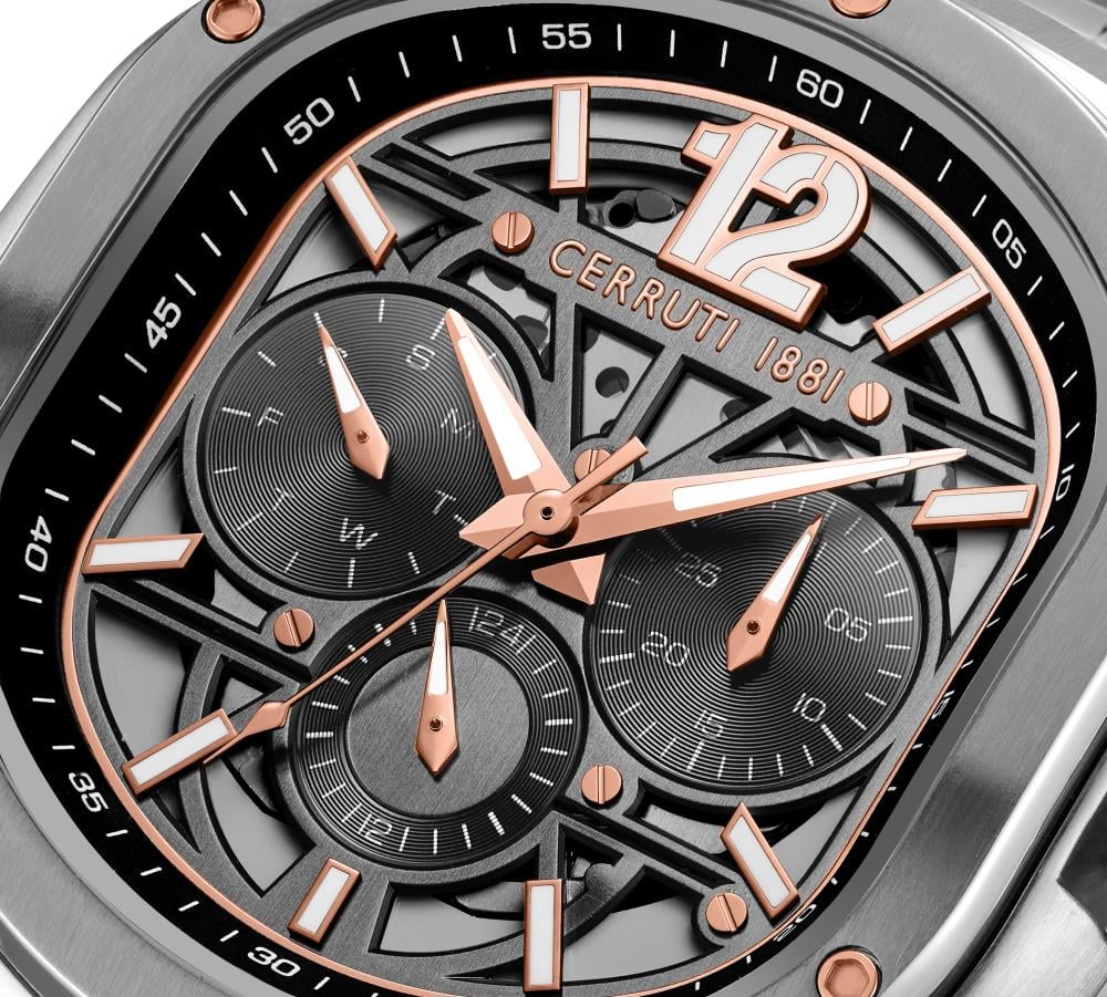 Cerruti 1881 men's watch with a black and rose gold dial and a silver stainless steel strap.